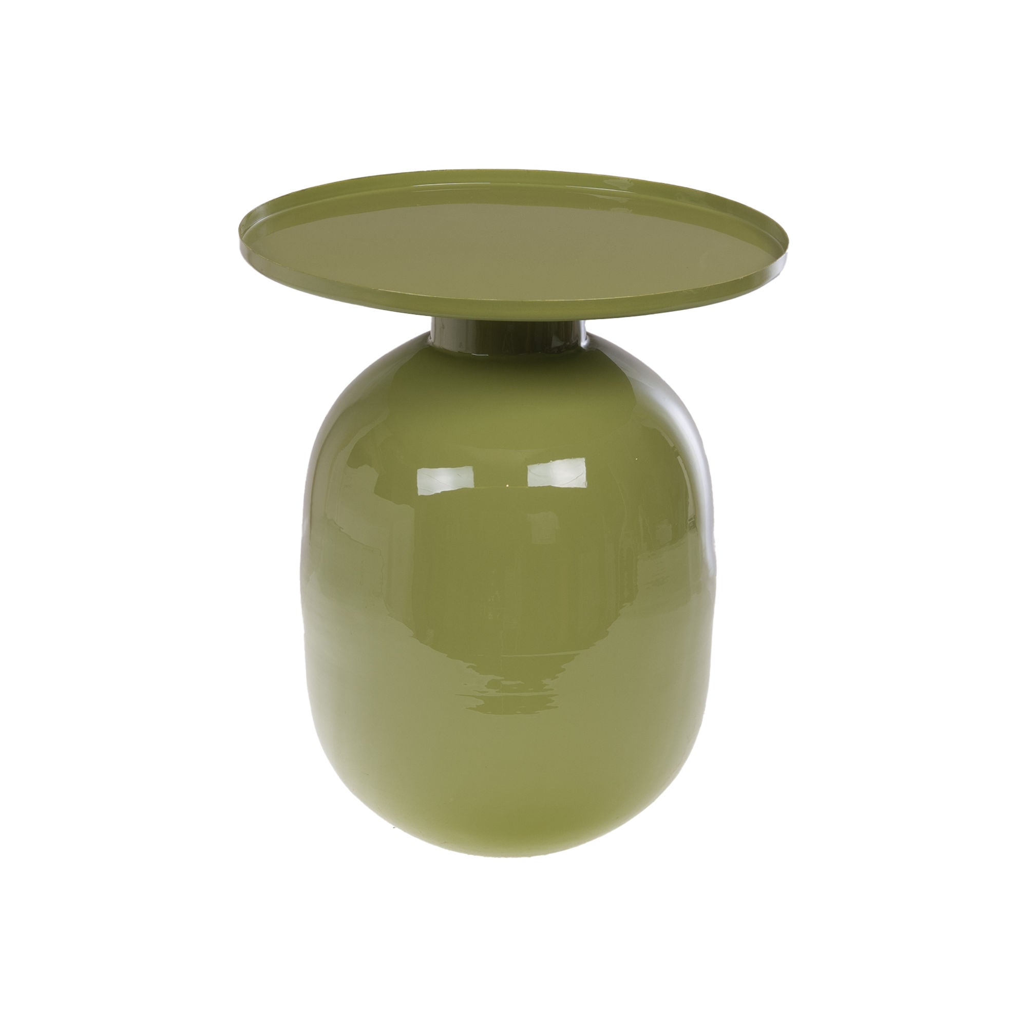 Bout de canapé en métal finition kaki, compact et léger (36x36x39 cm, 4 kg) idéal pour compléter une gamme de tables d'appoint modernes. Son design original avec base arrondie et plateau plat offre une touche contemporaine et fonctionnelle, adaptée à une clientèle recherchant des meubles décoratifs pratiques et stylés. Facile à intégrer dans divers univers déco.