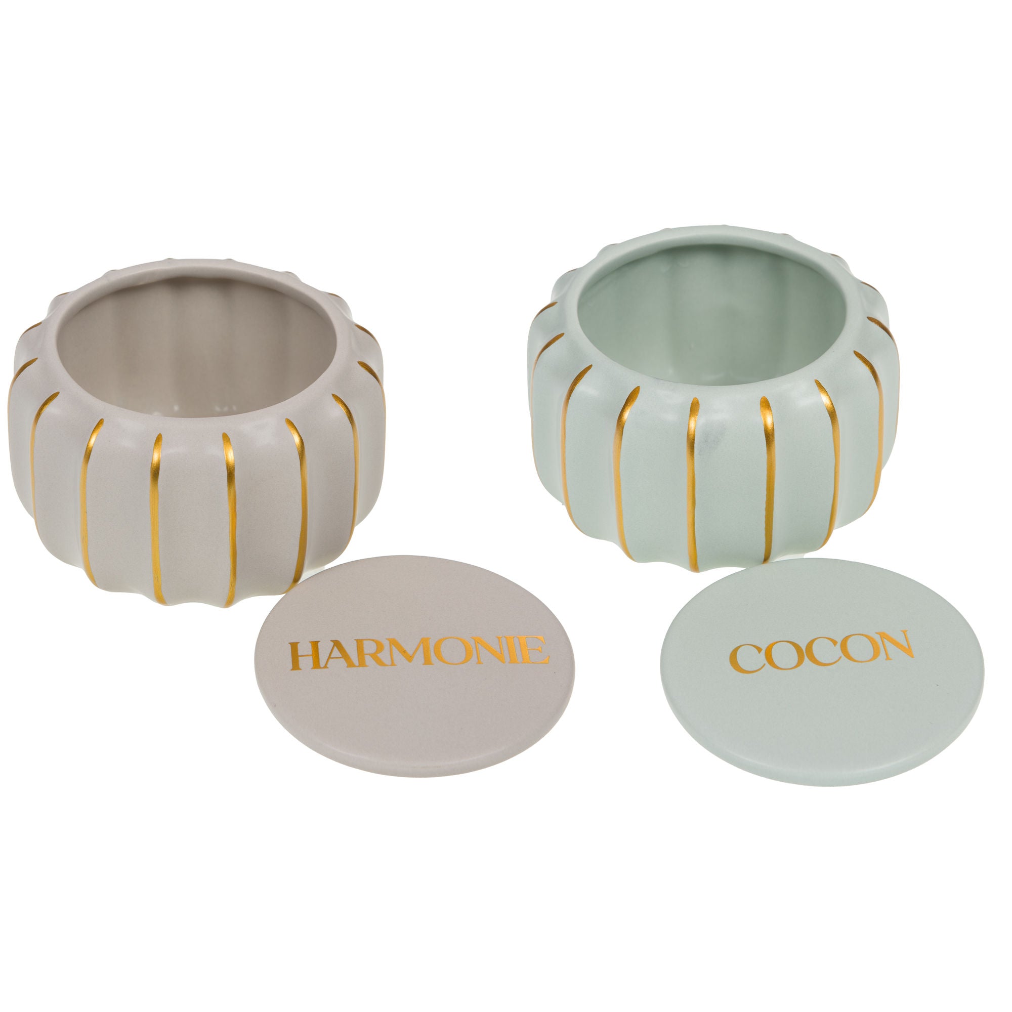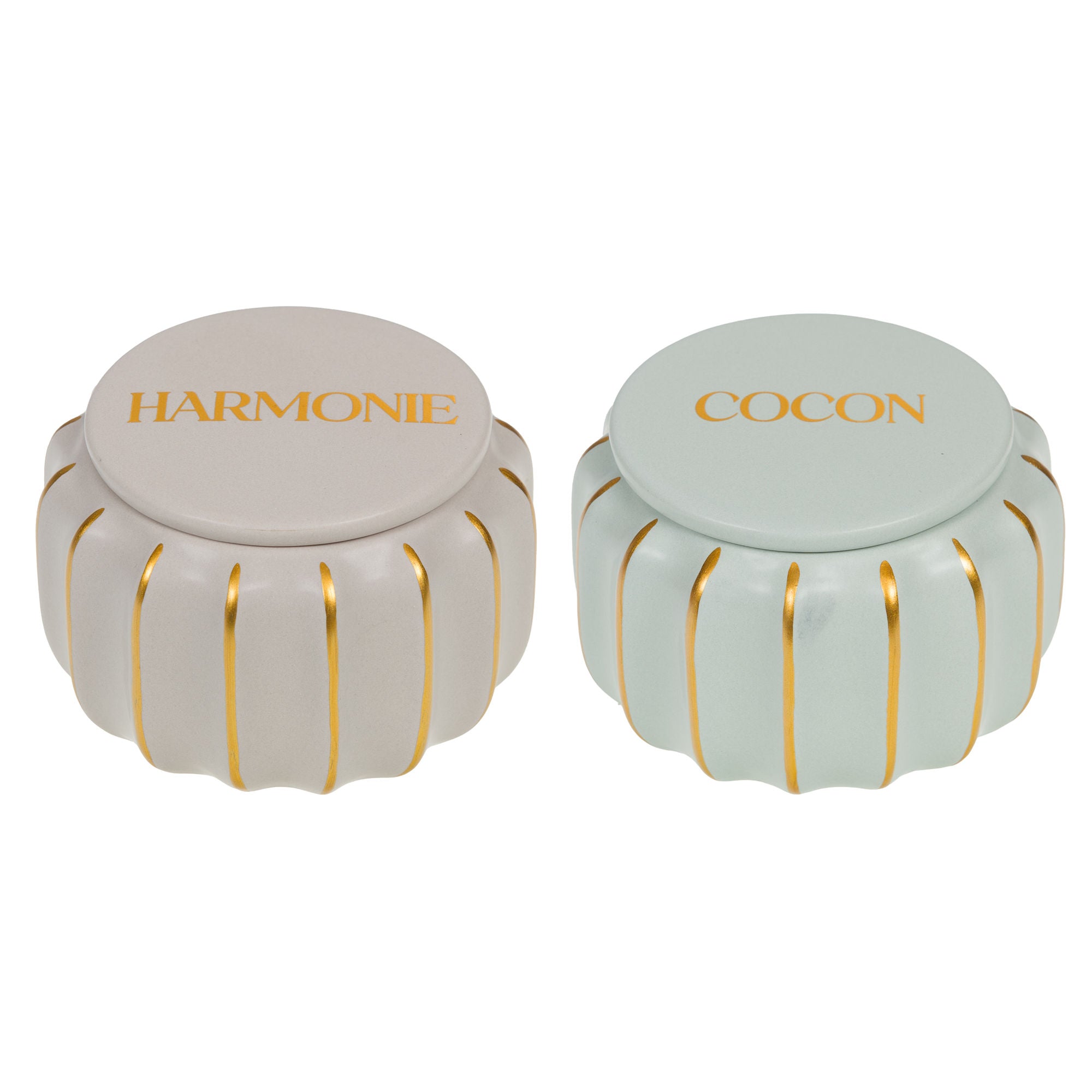 Boîtes rondes avec son couvercle en céramique décorative. Tendance et compacte, elles intégreront de façon subtile votre décoration. Finition dorée.